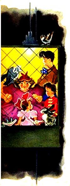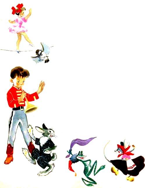 Между двумя дубами натянули канат. Закомашка пробежала по канату, она подпрыгивала и танцевала, и над нею летал воробушек. Внизу под канатом стоял Закомарик и играл на дудочке, вокруг него танцевали мышонок с лягушкой и волк с зайцем. Рядом с ними взад и вперед похаживал Всегдаищи, держа на вытянутой руке Потерях}. Гусак, как зритель, вытянул шею и сильно хлопал крыльями. Только Буль-буль равнодушно дожевывал траву, которую за ночь не успел съесть.