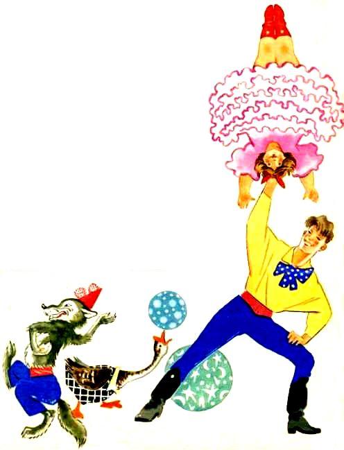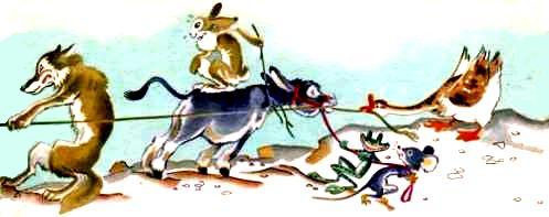 Волка с гусаком запрягли в тележку, и артисты тронулись в путь.