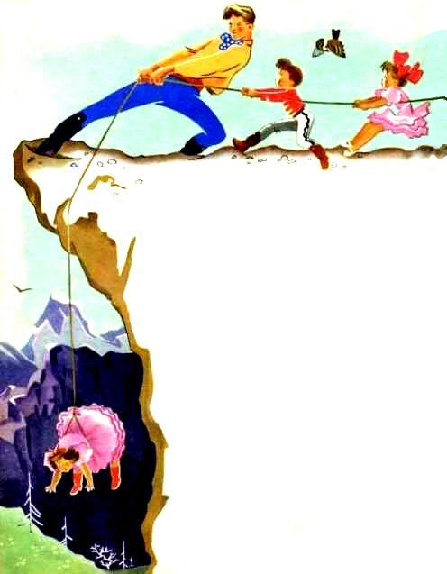 Вытащить волка и ослика на скалу было нелегко. Однако вскоре звери оказались там. Всегдаищи крикнул Потеряхе, чтобы она обвязалась веревкой. Всегдаищи, Закомарик, Закомашка, ослик, волк, заяц, гусак, мышонок, лягушка и воробушек ухватились за другой конец веревки.
