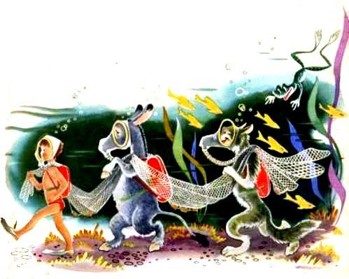 – крикнул Закомарик, зовя на помощь ослика с волком, и распустил сеть.