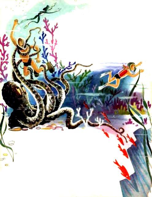 На дне моря было красиво. Под ногами лежал мелкий песок. Вокруг виднелись диковинные растения. Среди водорослей плавали рыбки. В одном месте высилась скала, а возле нее громоздились камни. Артисты приблизились к скале и между камнями обнаружили страшилище с круглой головой, огромными глазищами и многочисленными щупальцами. Это был огромный осьминог.