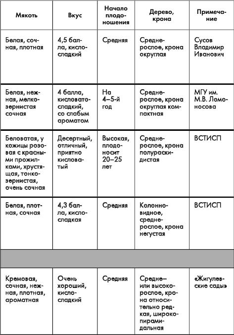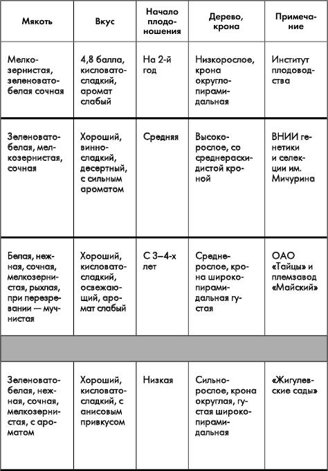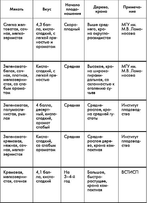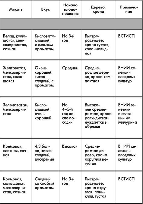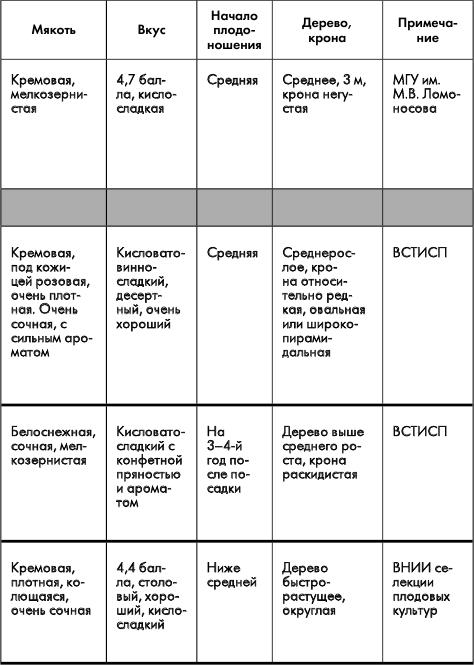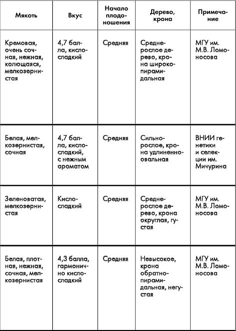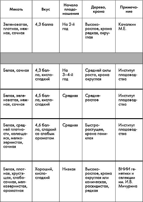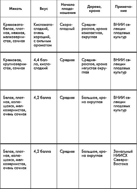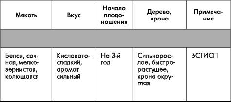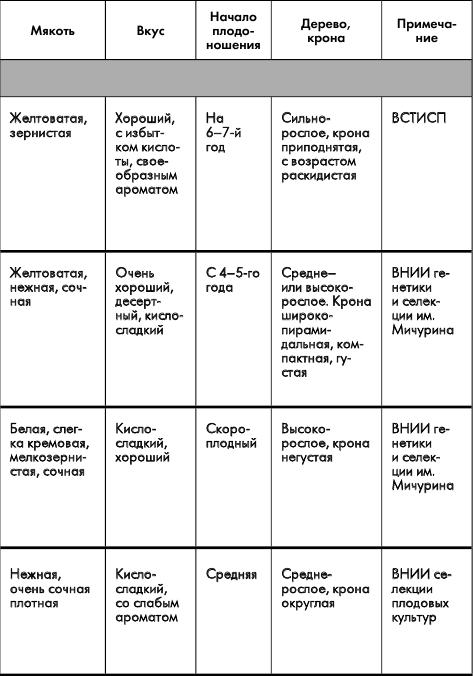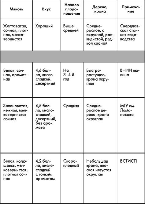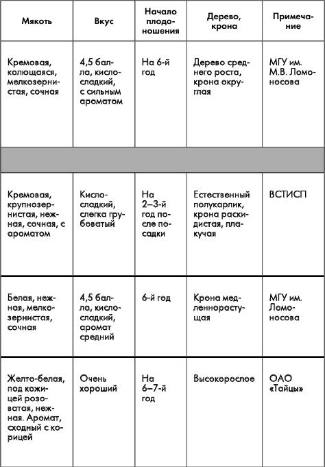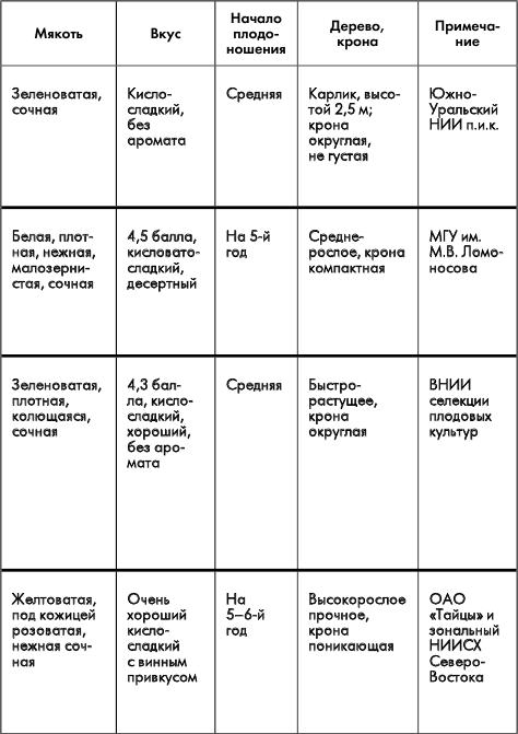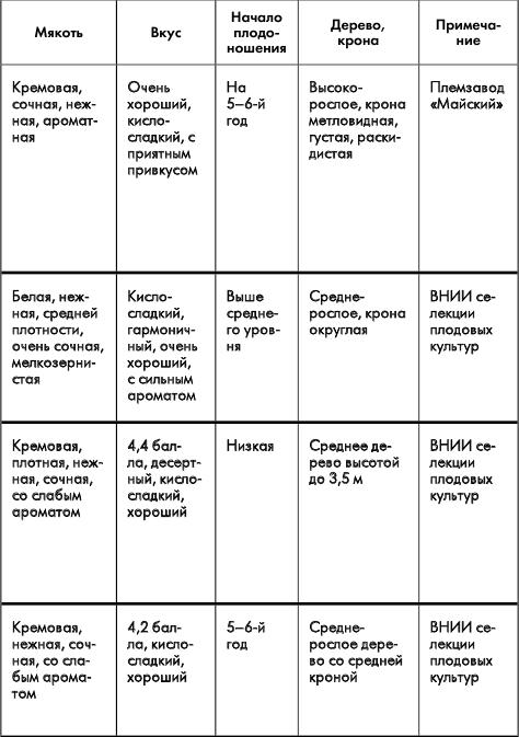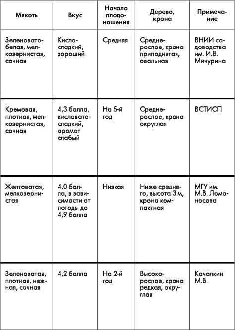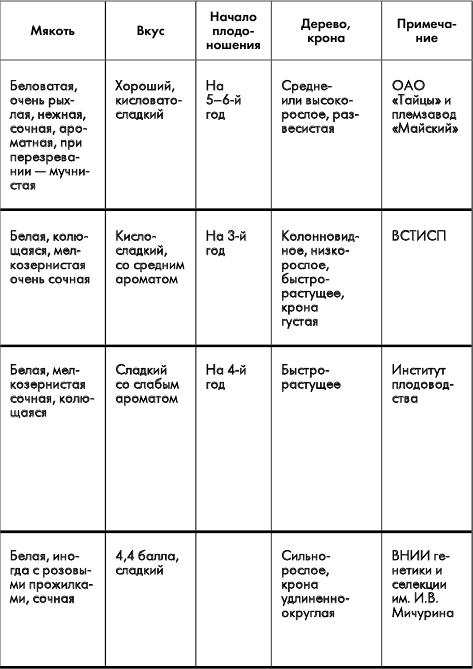 В восьмом столбце указано время начала плодоношения, т. е. скороплодность – высокая (на 3–4-й год после посадки), средняя (на 5–6-й год после посадки) и низкая (на 7-й год после посадки или позже).