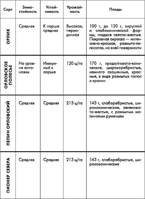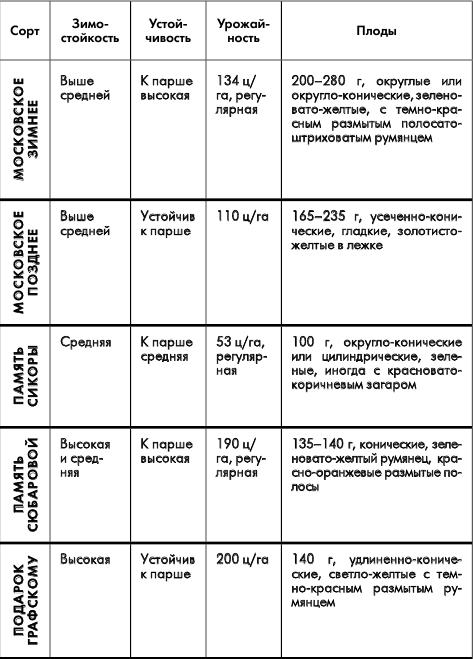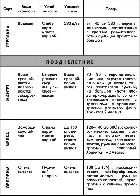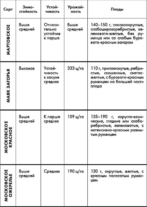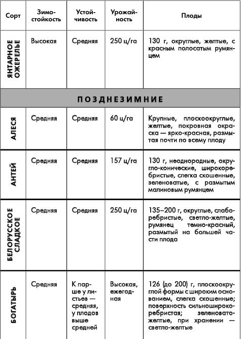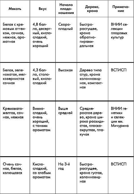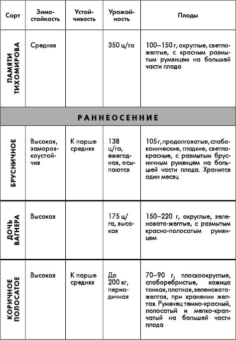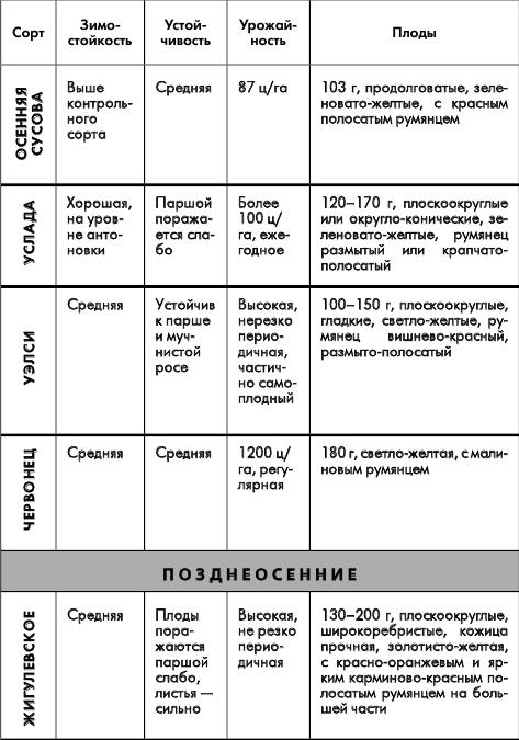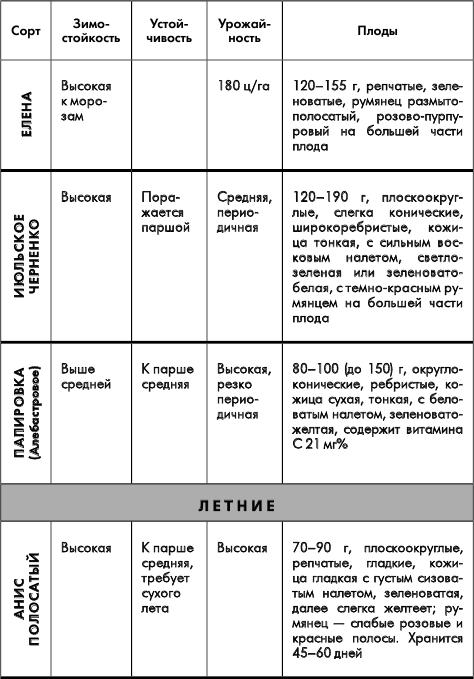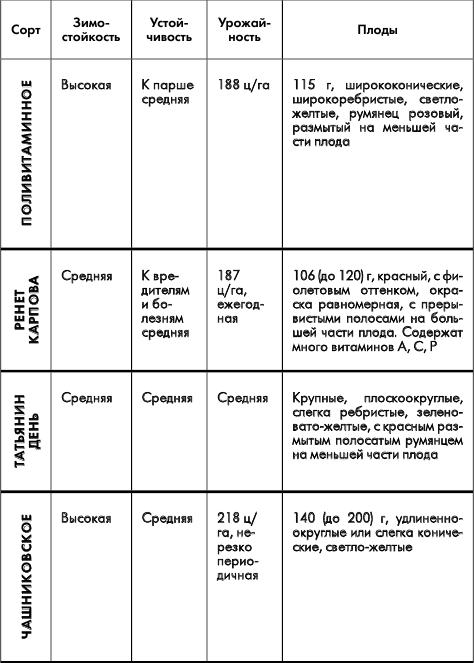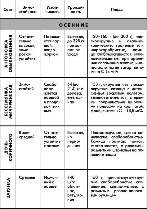 облегчения поиска сорта разделены на группы по периоду потребления плодов. Летние сорта созревают в августе, потребляются сразу после съема и хранятся недолго. Осенние сорта созревают в первой половине сентября и готовы к потреблению после 1–2 недель хранения. Зимние сорта готовы к съему во второй половине сентября, потребление через 1–2 месяца хранения.В первом столбце таблицы дано название сорта в алфавитном порядке по группам.