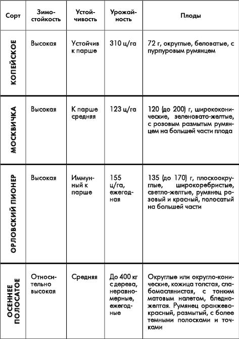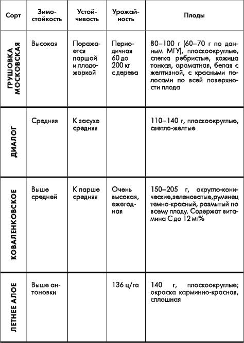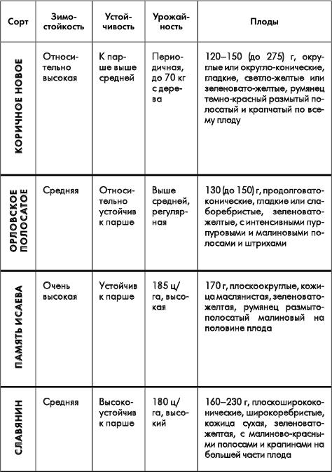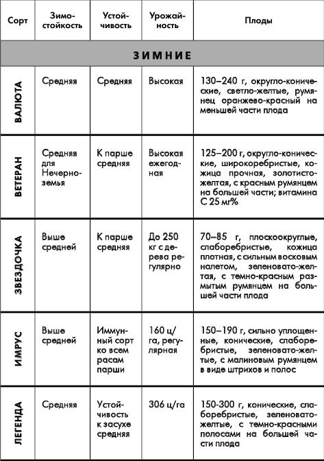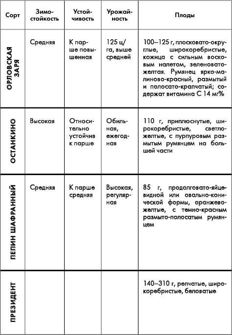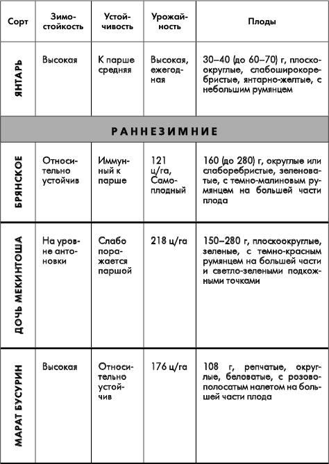 Во втором столбце таблицы указана зимостойкость, а в третьем – устойчивость к другим неблагоприятным условиям среды и болезням. Для некоторых сортов отдельно отмечена устойчивость (или чувствительность) к парше – одному из наиболее распространенных заболеваний яблони в Центральном регионе.