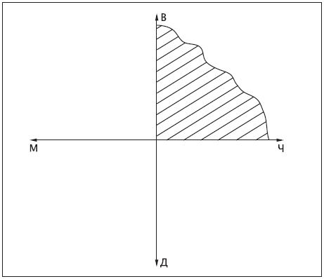 Теперь вернёмся к нашим спортсменам-горнолыжникам. Сразу скажу, что описанный выше подход в работе тренера успеха не принесёт. Он, на мой взгляд, в корне ошибочен. Безусловно, спортсмены тоже могут быть отнесены к одному или нескольким из указанных типов обучающихся. Даже среди малышей и юниоров среднего возраста встречаются и мыслители, и исполнители, и чувствовальщики, и визуалы. Опытный тренер может это легко и быстро определить без всяких специальных тестов. На основе своего многолетнего опыта работы со спортсменам различного уровня могу с полной уверенностью сказать, что успехов в горнолыжном спорте добиваются в основном люди, которые принадлежат к двум типам. Это чувствовальщики и визуалы. Результат их психологического теста в идеале должен попадать в середину затемненного квадранта графической диаграммы рис. 1.3.5.