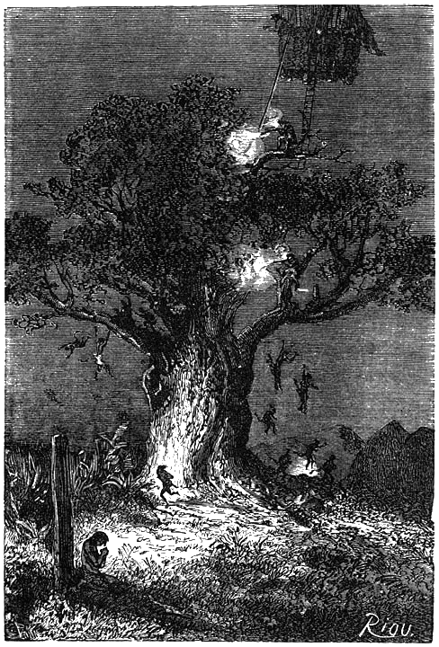 Ночь была очень темна. Доктор Фергюссон не мог определить, где именно они спустились. Якорь зацепился за вершину очень высокого дерева, которое едва вырисовывалось в ночном мраке. Как всегда, доктор нес первую вахту с девяти часов вечера, а в полночь его сменил Кеннеди.