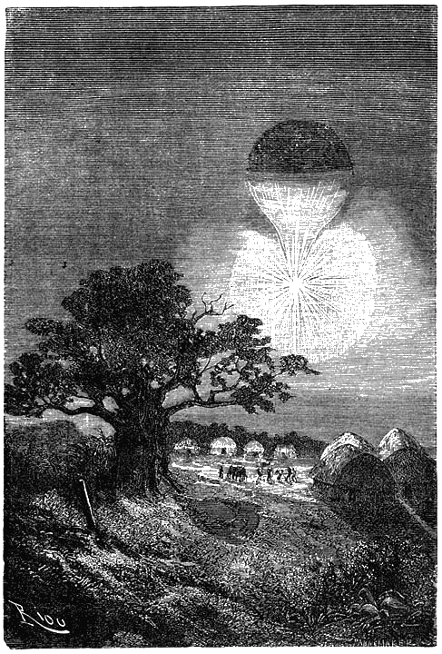 Приказ доктора сейчас же был выполнен. Едва заметный ветерок нес «Викторию» к пленнику; одновременно шар, вследствие охлаждения газа, мало-помалу спускался. Еще минут де сять «Виктория» плавала в волнах света. Ферпоссон все направлял на толпу ослепительный сноп лучей, от которого негры, придя в неописуемый страх, один за другим забились в свои хижины. Площадка опустела. Доктор был прав, возлагая надежды на сверхъестественное появление «Виктории», бросающей солнечные лучи среди ночного мрака.