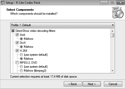 Здесь необходимо пояснение. Многие программы состоят из нескольких компонентов. При инсталляции таких приложений вам обычно предоставляется выбор, какие компоненты устанавливать, а какие – нет. Правда, для такого выбора надо представлять, для чего служит каждый компонент программы и понадобится ли он вам. Для облегчения задачи многие разработчики предлагают пользователю готовые наборы приложений: они либо приведены в раскрывающемся списке, как в программе K-Lite Codec Pack (рис. 6.7), либо оформлены в виде отдельного переключателя.