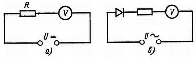 Рис. 20. Схемы вольтметров, измеряющих постоянное (а) и переменное (б) напряжения.