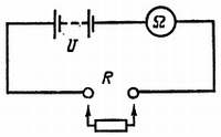 Я не могу позволить себе остановиться на этом. Ведь я объяснил тебе, как измеряют величину тока и напряжения. И у тебя, дорогой Незнайкин, должен возникнуть вопрос, каким образом измерить третью величину, входящую в формулу закона Ома: сопротивление. Нет ничего проще. Для этой цели гальванометр нужно дополнительно оснастить батареей с известным и очень стабильным