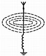 Рис. 43. Электромагнитные волны (показаны пунктиром), излучаемые передающей антенной.