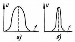 Рис. 45. Кривые, показывающие, как изменяется напряжение U на колебательном контуре в зависимости от частоты сигнала f. Кривые представлены для контура с низкой (а) и высокой (б) избирательностью.