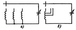 Рис. 46. Переключение с одного диапазона волн на другой осуществляется переключением катушек (а) или части витков одной катушки (б).