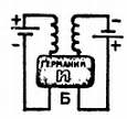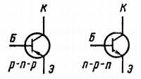 Л. — Совершенно верно. Коллектор же обозначается прямой линией, подходящей, как и стрелка эмиттера, к базе. Принятое условное обозначение верно отражает историческую действительность. Самые первые транзисторы, сделанные в 1948 г., не имели настоящих переходов. Эмиттер и коллектор этих транзисторов представляли собой металлические острия, опиравшиеся на кристалл германия (базу).