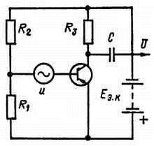 В этой схеме переменное напряжение на входе обозначено буквой u. Усиленное напряжение, получаемое на выходе при прохождении коллекторного тока по нагрузочному резистору R3, обозначено буквой U. Его пропускают через конденсатор связи С.