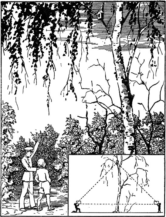 — Мог бы ты измерить, — спросил брат, — на высоте скольких метров висит эта скворечница? (Внизу направо показан способ измерения.)