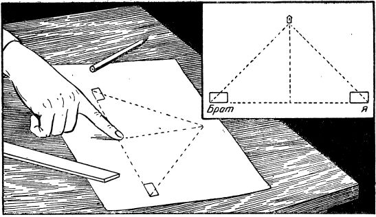 — Вот видишь, — объяснил мне брат, водя пальцем по чертежу, — нижняя линия в одиннадцать сантиметров — это расстояние от моего глаза до твоего, когда мы стояли с тобою у березы. Оно лишь