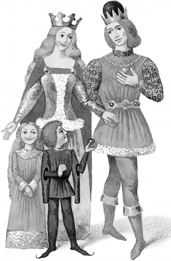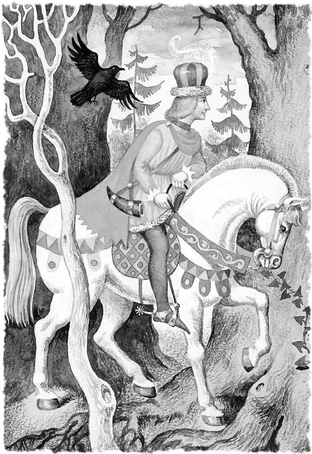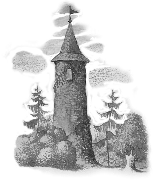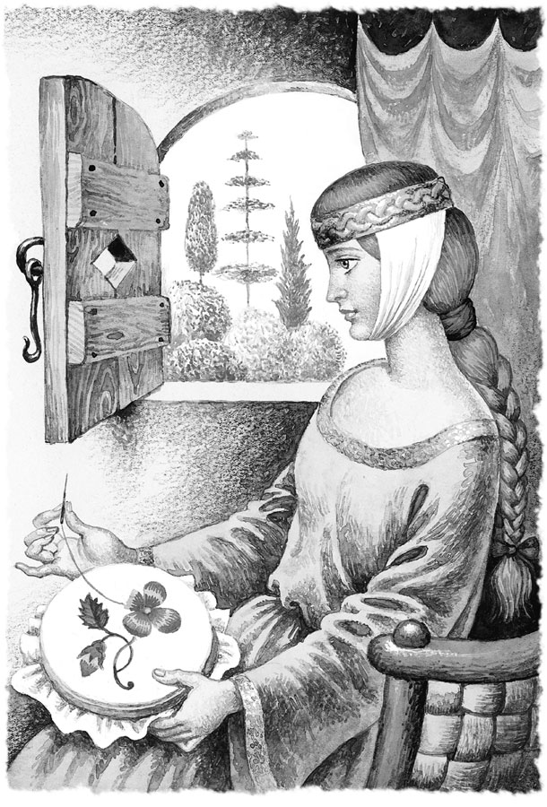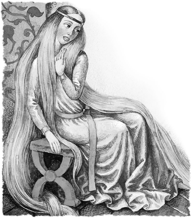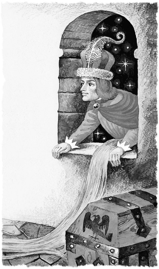 Тотчас спустились косы сверху, и королевич взобрался по ним на башню.