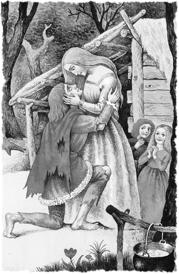 Так бродил он по лесу, питался одними кореньями и ягодами и горько оплакивал утрату своей милой. И много лет он скитался в величайшей нищете и наконец попал в пустыню, где бедствовала его милая, вместе с сыновьями-близнецами, которые у неё родились. Тогда он вдруг услышал голос, показавшийся ему знакомым; он пошёл прямо на этот голос, и, когда приблизился, Рапунцель узнала его и со слезами бросилась ему на шею. Две её слезинки попали ему на глаза, и глаза снова прозрели. И он мог видеть, как прежде. Тогда повёл он её с собою в своё царство, где все приняли их с радостью, и они долго жили счастливые и довольные.