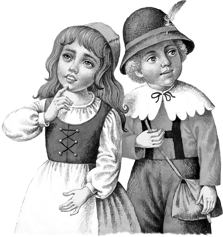 В большом лесу на опушке жил бедный дровосек со своею женою и двумя детьми: мальчишку-то звали Гензель, а девочку – Гретель. У бедняка было в семье и скудно, и голодно; а с той поры как наступила большая дороговизна, у него и хлеба иногда не бывало. И вот однажды вечером лежал он в постели, раздумывая и ворочаясь с боку на бок от забот, и сказал своей жене со вздохом: «Не знаю, право, как нам и быть! Как будем мы детей кормить, когда и самим-то есть нечего!» – «А знаешь что, муженёк! – отвечала жена. – Завтра ранёшенько выведем детей в самую чащу леса; там разведём им огонёк и каждому дадим ещё по кусочку хлеба в запас, а затем уйдём на работу и оставим их там одних. Они оттуда не найдут дороги домой, и мы от них избавимся». – «Нет, жёнушка, – сказал муж, – этого я не сделаю. Невмоготу мне своих деток в лесу одних оставить – ещё, пожалуй, придут дикие звери да их растерзают». – «Ох ты, дурак, дурак! – отвечала она. – Так разве же лучше будет, как мы все четверо станем дохнуть с голода, и ты только знай строгай доски для гробов!» И до тех пор его пилила, что он наконец согласился. «А всё же жалко мне бедных деток», – говорил он, даже и согласившись с женой. А детки-то с голоду тоже заснуть не могли и слышали всё, что мачеха говорила их отцу. Гретель плакала горькими слезами и говорила Гензелю: «Пропали наши головы!» – «Полно, Гретель, – сказал Гензель, – не печалься! Я как-нибудь ухитрюсь помочь беде!» И когда отец с мачехой уснули, он поднялся с постели, надел своё платьишко, отворил дверку да и выскользнул из дому. Месяц светил ярко, и белые голыши, [3] которых много валялось перед домом, блестели, словно монетки. Гензель наклонился и столько набрал их в карман своего платья, сколько влезть могло. Потом вернулся домой и сказал сестре: «Успокойся и усни с Богом! Он нас не оставит». И улёгся в свою постельку.