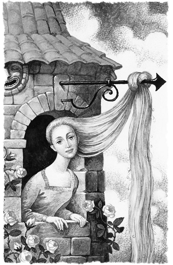 Тогда Рапунцель опустила вниз свои заплетённые косы, и волшебница поднялась по ним на верх башни. «Коли на верх башни по этой лестнице ходят, – подумал королевич, – так я тоже когда-нибудь попытаю счастья». И на другой же день с наступлением темноты он подошёл к башне и крикнул: