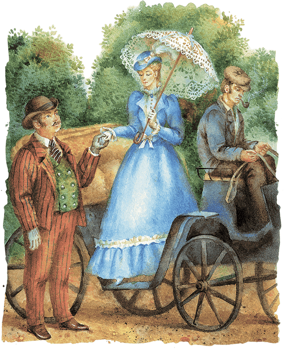 И тут он услышал вдалеке, в конце аллеи, топот копыт. Звук приближался, и вскоре из-за поворота показалась коляска. Две гнедые лошадки весело трусили по пыльной просёлочной дороге. Когда экипаж подъехал к калитке, кучер придержал их громким «Тпруу!».