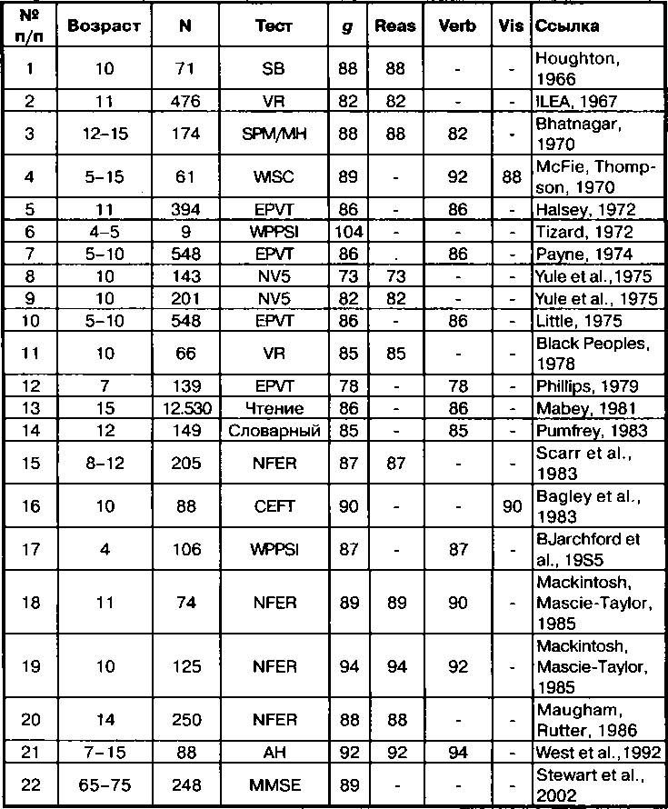 В строке 7 дан IQ в 86 баллов для общенациональной выборки афро- карибских детей в Великобритании. В строках 8 и 9 приведены значения IQ в 73 балла для детей из Великобритании, родившихся на Карибах, и в 82 балла для родившихся в Великобритании. Значение IQ в 73 балла у уроженцев островов Карибского бассейна близко к 71 — значению для аборигенных карибских детей. В строке 10 представлен вербальный IQ 86 для детей из Вест-Индии, тестировавшихся с помощью английского словарного теста в картинках. В строке 11 дан IQ 85 для детей выходцев из Вест- Индии в общеобразовательной средней школе города Ильфорд графства Эссекс; этот IQ ниже, чем у детей индусов, обучавшихся в той же школе, IQ которых составил 91 балл. Это первое в ряду исследований в Великобритании, продемонстрировавших, что у выходцев с островов Карибского бассейна показатели интеллекта ниже, чем у иммигрантов из Индии. В строке 12 дан словарный IQ в 78 баллов для всех детей выходцев из Вест- Индии, обучавшихся в общественных школах в Мидлендсе 7 , находящихся в ведении органов народного образования.