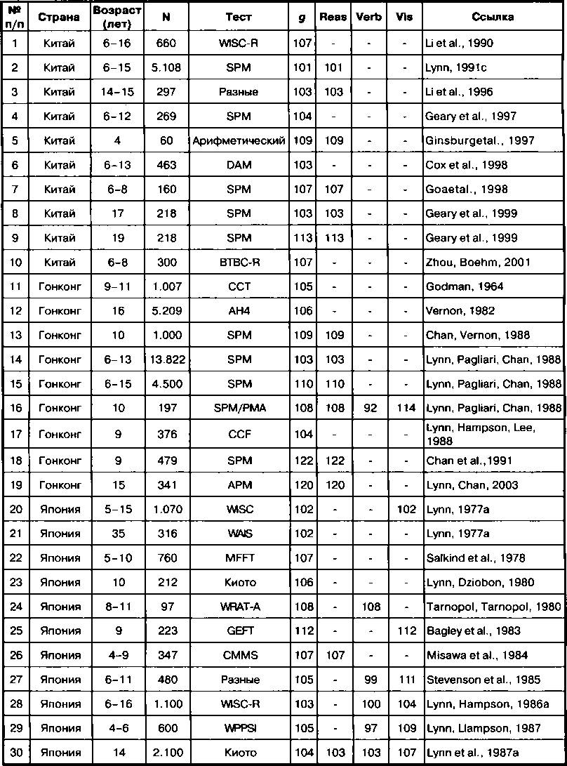 В строках 1-10 приведены результаты для Китайской Народной Республики. В строке 1 дан IQ в 107 баллов по данным стандартизации теста WISC-R в Шанхае. Это величина, вероятно, несколько выше, чем в Китае
