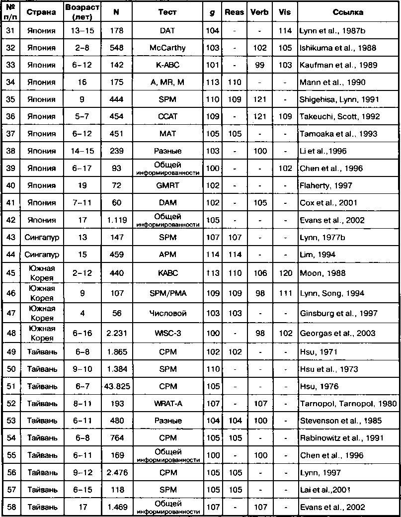 В строках 20-42 приведены значения IQ по исследованиям в Японии. В строке 20 дан IQ в 102 балла для всей Японии, вычисленный по данным японской выборки стандартизации теста WISC и основанный на результатах пяти тестов действия и теста повторения цифровых рядов Digit Span (вербальные тесты в японской версии теста были изменены и поэтому нами не учитываются); IQ визуализации (102 балла) вычислен по субтестам лабиринтов и складывания кубиков. В строке 21 дан IQ для Японии также в 102 балла, вычисленный по данным выборки стандартизации теста WAIS и основанный на данных субтестов замещения символов цифрами (Digit Symbol), складывания кубиков и Digit Span — лишь эти тесты не были изменены в японской версии. В строке 22 дан IQ в 107 баллов для японских детей возраста 5-10 лет по тесту MFFT, вычисленный по показателю количества ошибок по сравнению с американской выборкой (п=2.676). В строке 23 представлен IQ 106 для 10-летних японских детей, полученный с помощью японского теста Киото в сравнении с британскими детьми. В строке 24 приведён IQ 108 для выборки детей из Хиросимы по результатам арифметического субтеста WRAT. В строке 25 дан IQ 112 для японских детей из г. Нагоя и Хамамацу. В строке 26 приведён IQ 107, полученный на японской выборке стандартизации Колумбийской шкалы умственной зрелости.