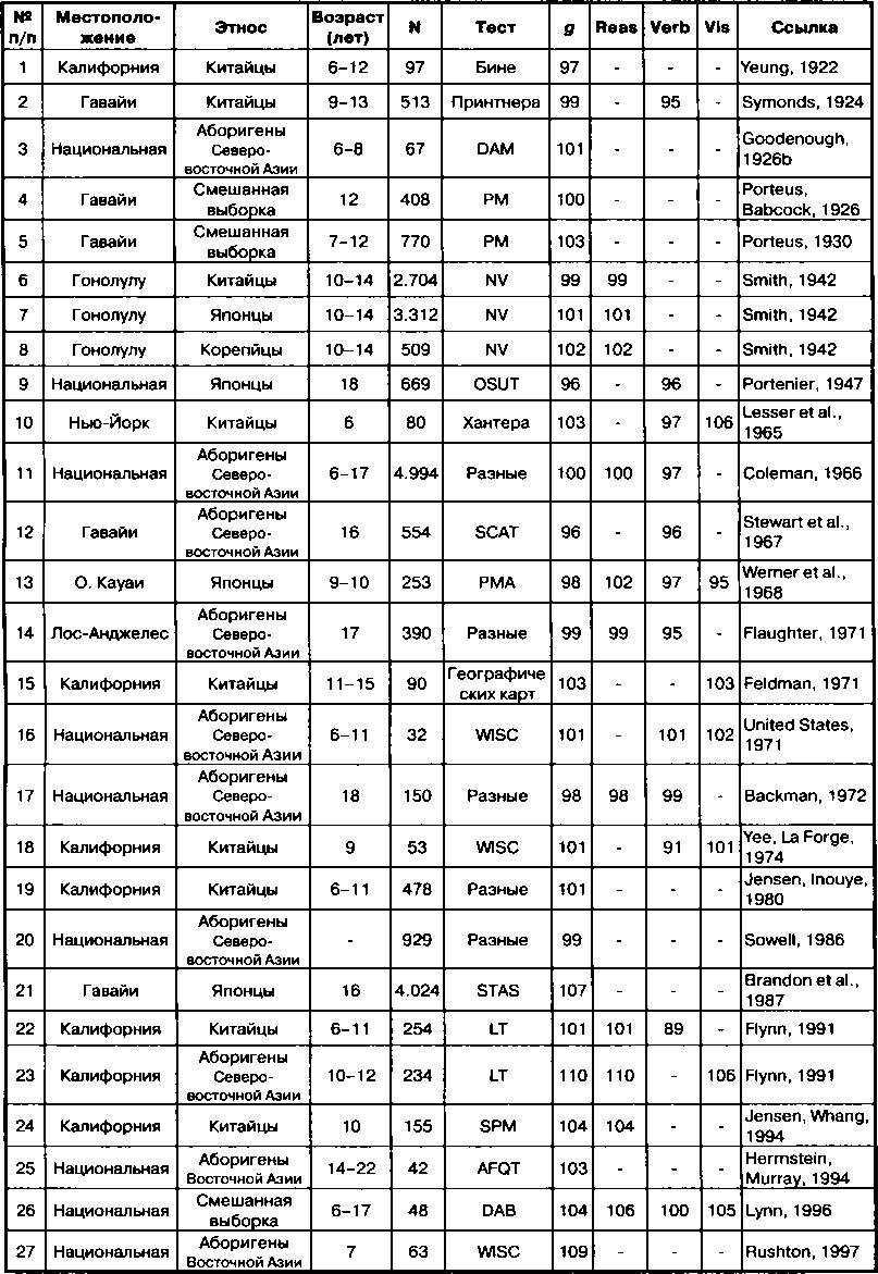 В строке 23 приведены результаты, собранные Дженсеном в богатом районе г. Беркли, Калифорния, и обработанные Флинном. Как дети китайцев и японцев, так и дети белых, получили высокие оценки. Цифры, помещённые в таблицу, являются оценками Флинна для детей выходцев из Восточной Азии, вычисленными относительно национальных норм. В сравнении с белыми детьми из того же района (п= 1.506) дети выходцев из Восточной Азии получили IQ в 98 баллов для рассуждения и в 95 баллов для вербального интеллекта. Эта выборка не является репрезентативной. В строке 24 приведены результаты для выборки китайцев из Калифорнии. В строке 25 дан IQ в 103 балла для небольшой, но национально репрезентативной выборки подростков. В строке 26 дан IQ 104 для американских выходцев из Азии по данным выборки стандартизации дифференциальной шкалы способностей (Differential Ability Scale). Американская перепись населения 1980 г. показала, что приблизительно половина американских выходцев из Азии — выходцы из Восточной Азии: этнические китайцы, японцы, корейцы и некоторое количество вьетнамцев9. Остальные — главным