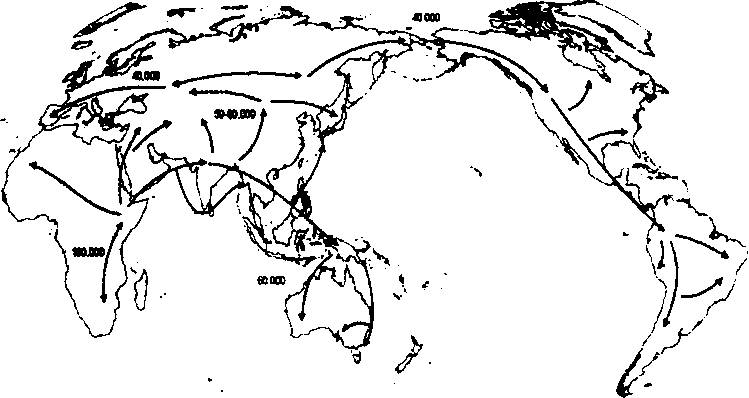примерно 1,5 миллиона лет назад, и, наконец, Homo sapiens (современный человек), появившийся приблизительно 150.000 лет назад (Relethford, 1988). Примерно 100.000 лет назад группы Homo sapiens начали мигрировать из экваториальной Африки в другие области мира и приблизительно 30.000 лет назад колонизировали большую часть земного шара. В начале этого периода они распространились по большей части Африки южнее Сахары и 100.000 лет назад они уже населяли Юг Африки, где эволюционировали в бушменов. Примерно 88.000 лет назад они обосновались в Юго-западной Азии. В период от 60 до 40 тыс. лет назад они расселились по всей Азии и примерно 40 тыс. лет назад заселили Европу, Индонезийский архипелаг, Австралию и оба континента Америки. В течение последних 6.000 лет или около того они колонизировали острова Тихого океана (Foley, 1997; Mellars, Stringer, 1999; Cavalli-Sforza, 2000). На рисунке 1 представлена составленная по данным археологических находок карта, показывающая приблизительное время и направления миграций современного человека.