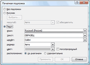 (Watermark – Custom watermark). В появившемся окне Печатная подложка