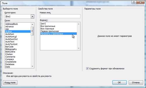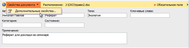 Свойства документа и вставка полей