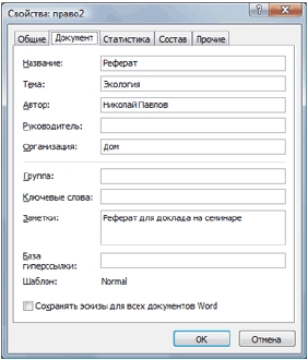 параметров документа, таких как имя автора, название организации, даты создания и