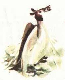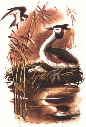 Прилетели на озеро и видят: посреди воды на тростниковом островке сидит большеголовая птица. На голове у птицы перья торчком стоят, словно рожки.