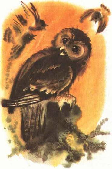 Неясыть громко щёлкнула своим страшным роговым клювом. Сплюшка скользнула с ветки и быстро исчезла в темноте. Ей совсем не хотелось драться с большой и сильной неясытью. В другое время она не уступила бы своего гнезда без боя. Но был уже сентябрь: ей пора было лететь на юг.