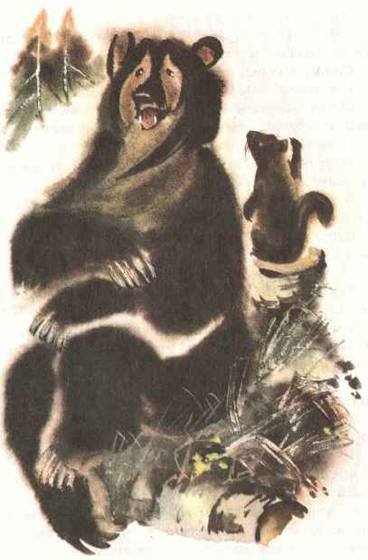 Инойка-Медведь сел лицом в ту сторону, где утром из-за леса солнцу вставать. А Кузяр-Бурундук сел лицом туда, где вечером солнце зашло за лес. Спиной к спине сели и сидят — ждут.