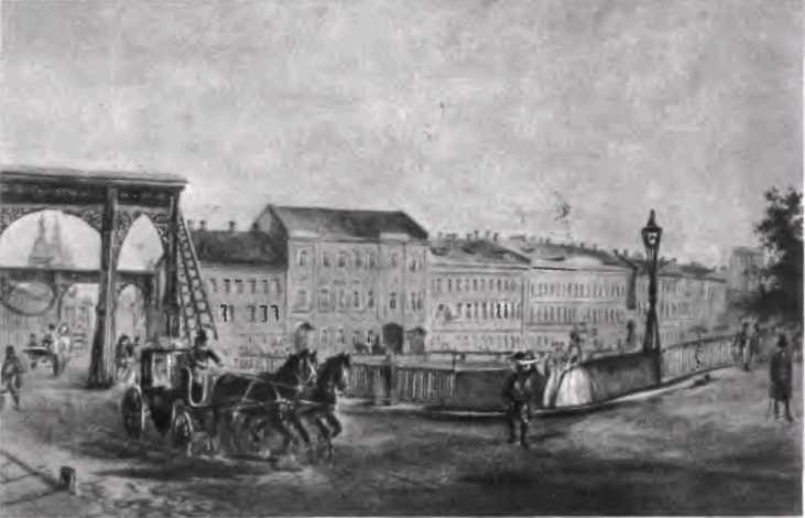Петербург 1830-х годов. Цепной мост на Фонтанке. Третий слева направо — дом Венецкои в