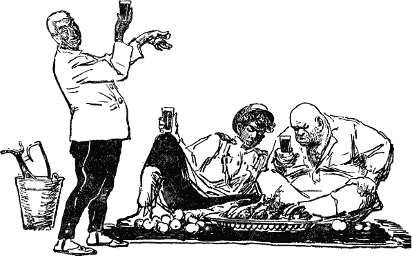 Среди деревьев на траве лежал толстый ковер с цветными узорами, на нем дымилось огромное фаянсовое блюдо с бараньей долмой, грудой были насыпаны абрикосы, а в ведре холодной воды плавал,