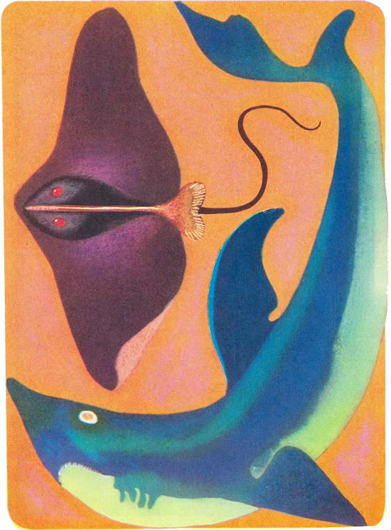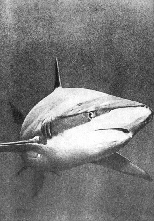 Серыми призраками возникают они в мутной голубизне, явившись внезапно откуда-то, где «дивья темь морская». И вот будто нехотя, лениво описывают круги: все уже, все ближе. Словно намеченная жертва не очень даже их интересует — и вдруг… Забурлила вода и окрасилась кровью. Бросок атакующей акулы неуловимо быстр. За первой нападает вторая, третья… Все, сколько их тут, в неистовстве рвут на куски черепаху, дельфина, раненого кита, человека — всякого, кто стал их жертвой.
