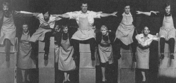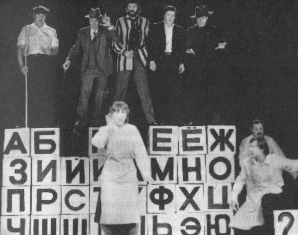 И только когда у меня в башке родился этот образ — плоскость, которая наклонена чуть ли не на сорок пять градусов в зрительный зал, а в конце плаха, тогда я понял, что можно играть. Потом я связал их одной цепью, потом всобачил им топоры, и, когда я понял, что они смогут прочесть эти стихи, тогда только попросил написать интермедии Николая Робертовича Эрдмана, потому что понимал, что они сдохнут, что сил не хватит, хотя пьеса короткая, в одном действии. Она вообще шла час тридцать пять — час сорок вся, я понял, что антракта не может быть. И мне стало ясно, как это делать. Поставил я очень быстро. Я заболел, они без меня ковырялись-ковырялись, я вернулся после болезни и пришел в ужас: чего они там ни творили — и лазили, и прыгали, и скакали — ничего не получалось. Хотя вроде я начал репетировать нормально. А, видимо, им казалось все это маловыразительно, и они, видите ли, обогащали беспрерывно, как во время восстановления «Высоцкого» в 1988 году. Я подумал, что я ошибся в оформлении, все уже стояло на сцене, а толку было мало. Но потом вдруг быстро все вправилось. Значит, замысел был правильный.