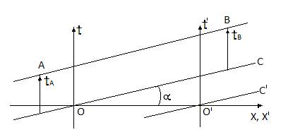 событий поясняется на рис. 1. 3. Здесь в координатах XOt изображена зависимость от координаты слагаемого переноса x/Ve. Это прямая OC, наклонённая к оси OX под некоторым углом , для которого tg = 1/Ve. Назовем прямую OC прямой синхронизации. Прямая AB, параллельная прямой синхронизации замечательна тем, что события расположенные на ней одновременны, так как для точек этой прямой истинное время одинаково (например, tA = tB). Пусть теперь часы двигаются вместе с подвижной системой XIOItI вдоль оси OX. При этом прямая синхронизации (теперь уже OICI) будет сдвигаться параллельно прямой OC, а значит и параллельно прямой AB, а потому tIA = tIB. Из этого следует, что если в одной системе координат события A и B одновременны, то они будут одновременны и в другой системе координат.Ввиду важности понятия одновременности остановимся на этом подробнее. Рассмотрим высказывание: пусть в момент времени t координаты точки равны x,y,z. В мире математики это высказывание есть не что иное, как определение неявной функции четырех переменных в виде F(x,y,z,t) = 0. Однако в мире физики это высказывание можно трактовать как угодно, если не сделать дополнительного соглашения (между физиками и математиками). Каково должно быть это соглашение? Оно должно быть таково, чтобы высказывания физика и математика относительно реального мира были тождественны. Это следующее соглашение: отметки на часах о времени события, а также отметки на координатных осях о положении точки должны делаться за время равное нулю (далее кратко, нуль – соглашение). Это соглашение необходимо и полезно, потому что теперь математический аппарат приобретает физический смысл. Это соглашение в неявной форме всегда присутствует в «правильных» формулах физики.