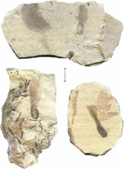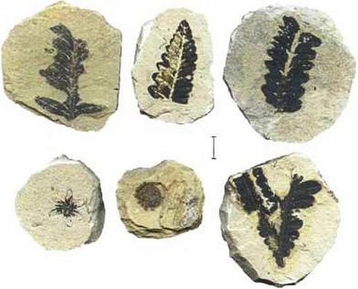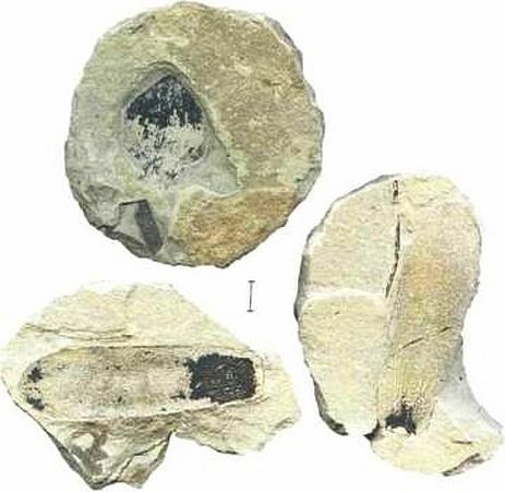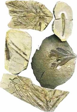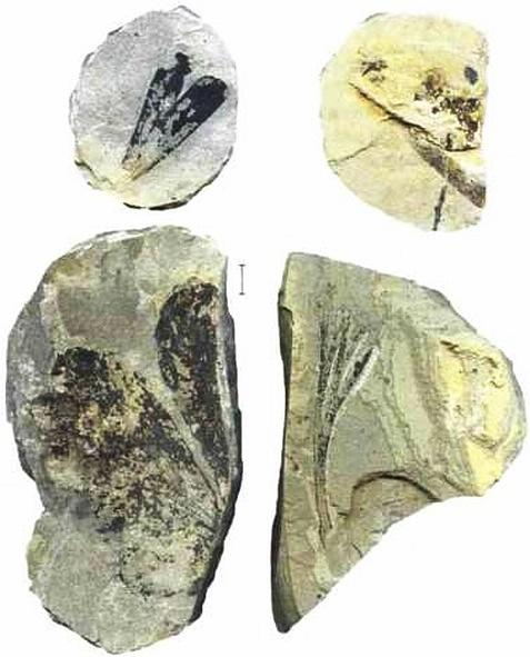 Некоторые учёные считают, что именно из Субангарской области в то время и «вышли в свет» гинкговые. Это мнение основывается на находках в ранней перми Западного Приуралья кистевидных собраний семян, очень похожих на семеносные органы ранних гинкговых (фото 27, справа вверху), а также на находках листьев явно «гинкгового» облика. Но всё же надо помнить, что древние растения преподносят порой сюрпризы и показывают нам, что надо быть очень осторожными и не судить обо всём растении по одному какому-то органу. Так, возможно, получилось и в случае с раннепермскими гинкговыми. Казалось бы, двулопастной лист (почти такой же как на фото 27, вверху слева) несомненно принадлежит гинкговым. Он даже относится к роду Sphenobaiera(сфенобайера), введённому для листьев древних гинкговых. Но вот относительно недавно, в 2003 году, в Африке был найден отпечаток ветки, на которой росли листья рода сфенобайера вместе с ни на что не похожими семеносными органами. Эти органы напоминали овальный листочек с загнутыми краями, с нижней стороны которого в два ряда, параллельно средней жилке, прикреплялись семена. Правда, ветка та жила на белом свете гораздо позже наших пермских листьев – в середине триасового периода и никак не могла принадлежать тому же естественному виду, что и пермские растения с листьями сфенобайера. Но дело в том, что семеносные органы, очень похожие на только что описанный лист с двумя рядами семян, были известны и из перми Приуралья. Их отнесли к роду Stiphorus, выдвигались различные гипотезы, какому же растению они принадлежали, но точно определить так и не смогли. И лишь африканская находка позволила учёным предположить, что, возможно, раннепермские сфенобайера и стифорус – части одного растения.