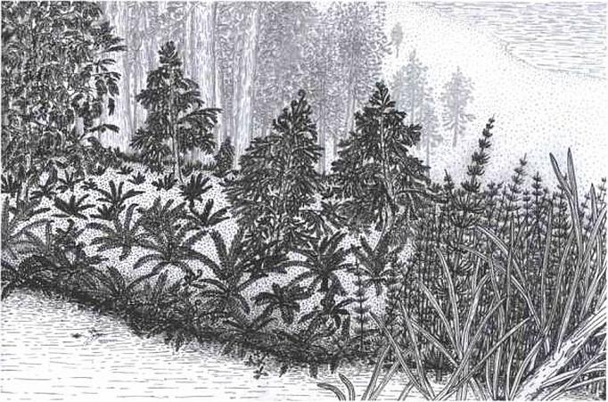 Странный ландшафт! Трудно представить себе его… По берегам рек и озёр тянется унылая щётка из палок разной величины. Некоторые завалились. Вода подхватывает их и несёт, сбивает кучами в заводях. Местами щётка прерывается зарослями папоротниковидных растений с округлыми листьями-пёрышками… Осеннего листопада, наверное, ещё не было. Вместе с этими растениями никогда не встретишь ни косточки какого-нибудь четвероногого, ни крылышка насекомого. Тихо было в зарослях».