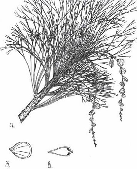 Ещё одной очень своеобразной группой мезозойских растений были чекановские или лептостробовые. Их называют так по роду, предложенномудля листьев – Czekanowskiaили по роду Leptostrobusдля семеносных органов. Эти растения, широко распространённыена территории нынешней Сибири и в Европе, традиционно относят к классу гинкговых. Но посмотрите на рис. 13! Узкие лентовидные листья действительноочень напоминают сильнорассеченные листья гинкго, но вот органы размножения… Семеносные капсулы чекановскиевых похожи на раковину двустворчатого моллюска, внутри которой, по четыре штуки на каждой створке, располагались семена. Створки, судя по всему, были плотно сомкнуты и раскрывались только после созревания семян. А это означает, что пыльца не могла попасть прямо на семязачаток, а улавливалась сетью волосков и выростов, расположенной по краю капсулы. Потом, видимо, пыльцевая трубка прорастала внутрь капсулы, к семязачаткам. Такой процесс больше напоминает опыление цветковых, чем голосеменных. Может быть поэтому некоторые учёные предлагали и чекановские выделить в свой самостоятельный класс. Появившись в позднем триасе, лептостробовые навсегда исчезают в раннем мелу.