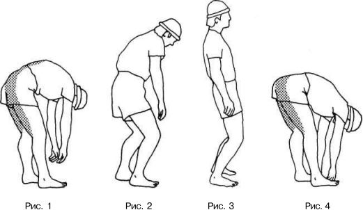 Попробуйте сами. Из исходного положения стоя медленно нагибайтесь вперед от бедер (ноги слегка согнуты в коленях), пока не почувствуете комфортного растяжения (рис. 1). Отметьте, как низко вам удалось наклониться. Вернитесь в исходное положение, не разгибая ног (рис. 2).
