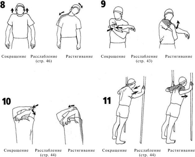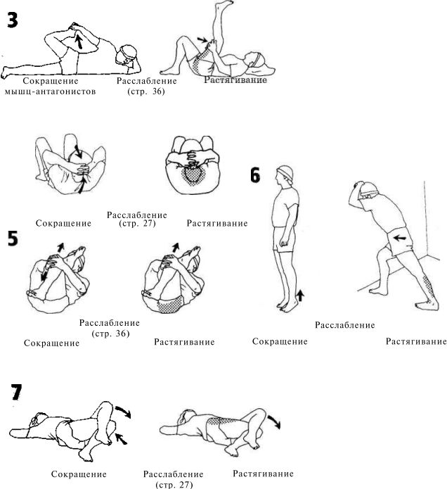Предлагаем несколько упражнений по методу ПНС в том виде, в каком они описаны на предыдущих двух страницах. Испробуйте на себе их эффективность (в плане увеличения амплитуды движений). После того как вы усвоите суть методики, вам не составит труда применить такую технику к любому упражнению. Сокращение — расслабление — растягивание, сокращение — расслабление — растягивание и т. д.