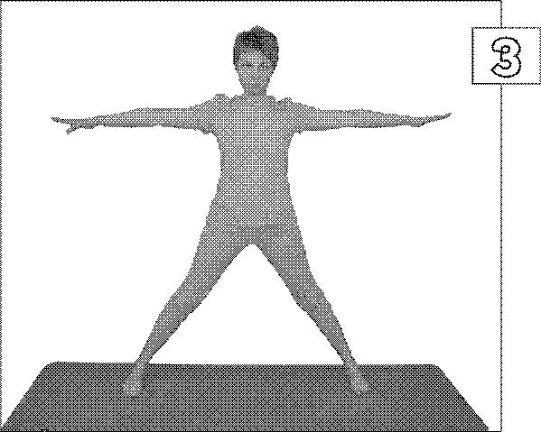 3. На вдохе, поднимаемся в промежуточное положение: руки в стороны, ступни параллельно. Фиксация, выдох – вдох – выдох.