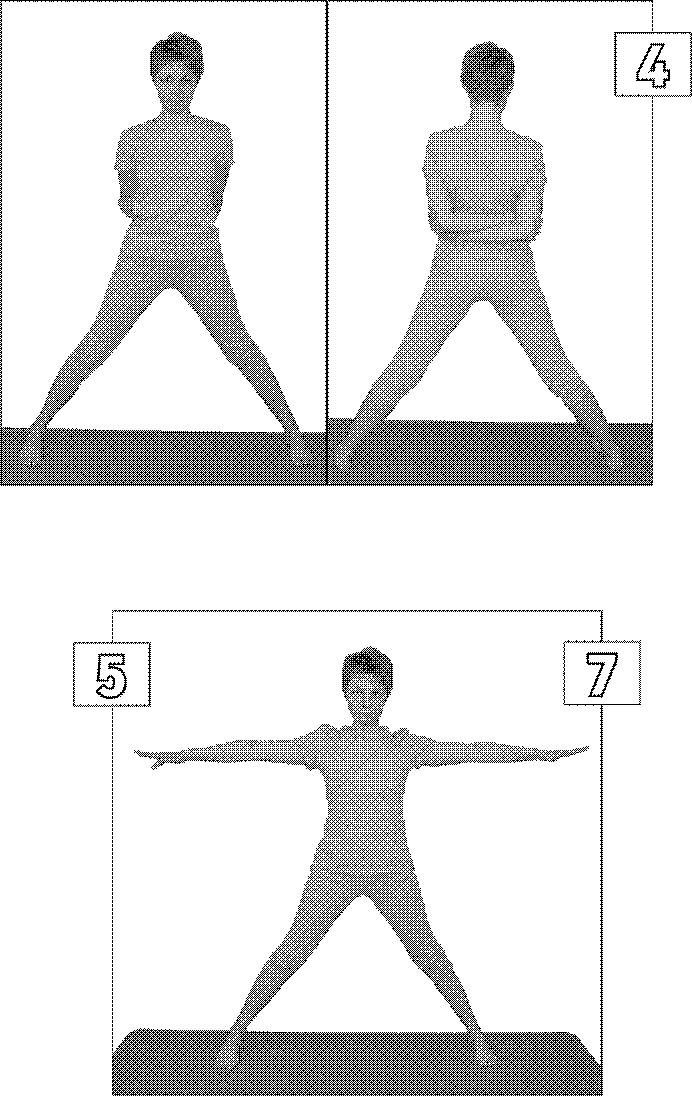 7. Немного отдохнем в этом положении. Затем вновь поверачиваемся вправо на 90 градусов, одновременно отшагивая правой ногой в сторону, руки разводим в стороны. Мы с вами приняли промежуточное положение.