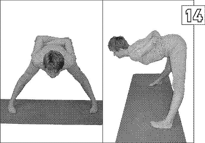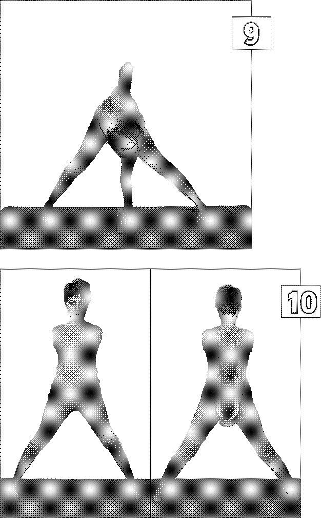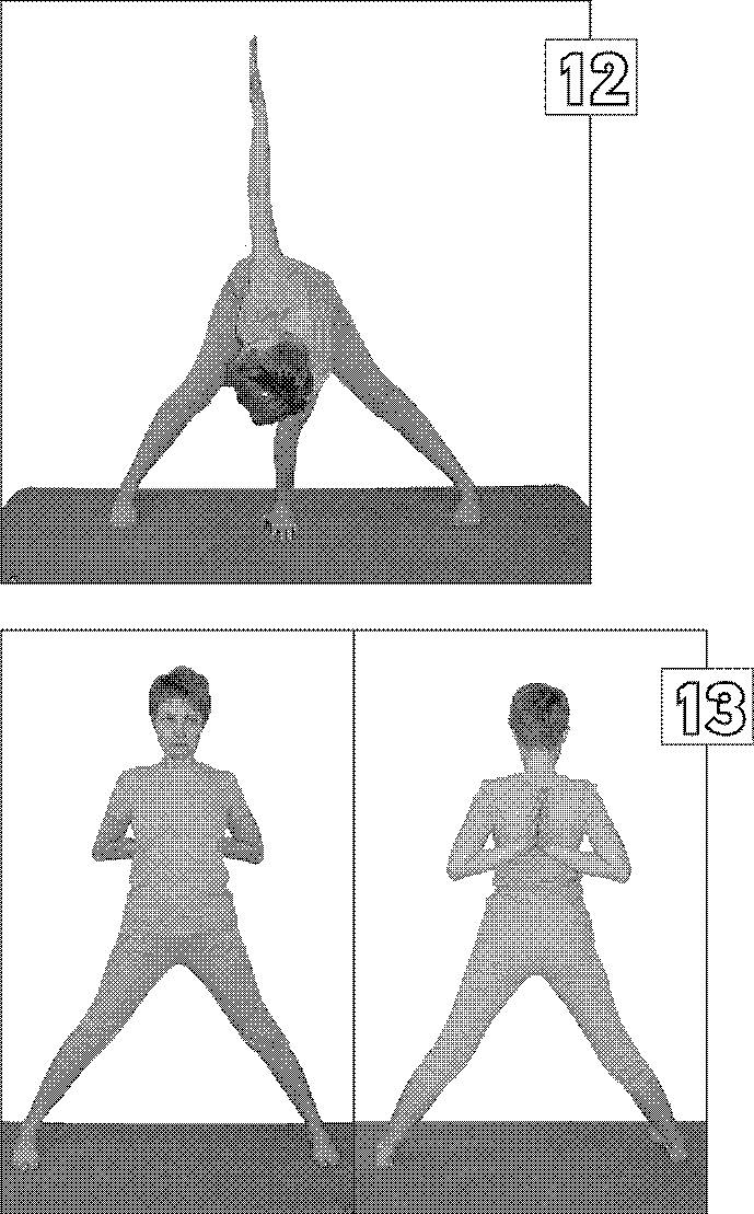 14. На выдохе наклоняемся вперед как можно ниже, не сгибая ноги в коленях и не горбясь.